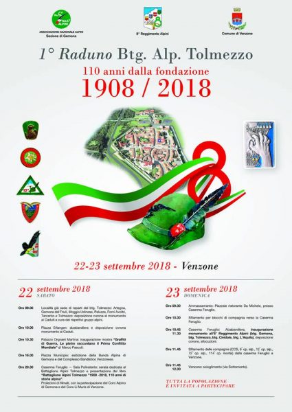Si inizia sabato 22 settembre 2018 alle ore 10.00 in Piazza Erlangen, con l’alzabandiera e la deposizione della corona presso il Monumento ai Caduti. Alle ore 16.00 esibizione della Banda Alpina di Gemona, mentre alle ore 20.30 presso la Caserma Feruglio ci sarà la serata dedicata al Btg. Alpini di Tolmezzo e presentazione del libro "Battaglione Alpini Tolmezzo 1908-2018, 110 anni di storia alpina”, seguita dalla proiezione di filmati con la partecipazione del Coro Alpino di Gemona e il Coro Li Muris di Venzone.